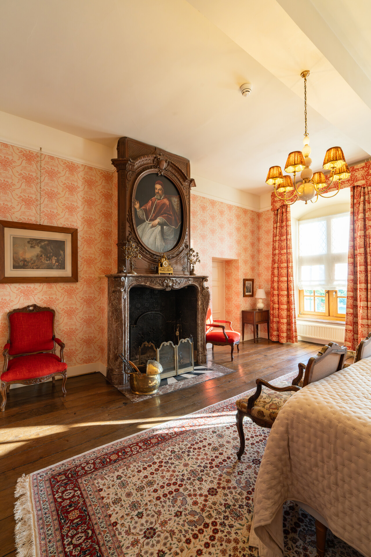 Heerlijk slapen onder het toeziend oog van de Paus. Een ruime, sfeervolle kamer met een comfortabele zithoek en een prachtig uitzicht over het landgoed. De luxe badkamer, eveneens met uitzicht, is voorzien van een bad, douche, wastafel en wc.